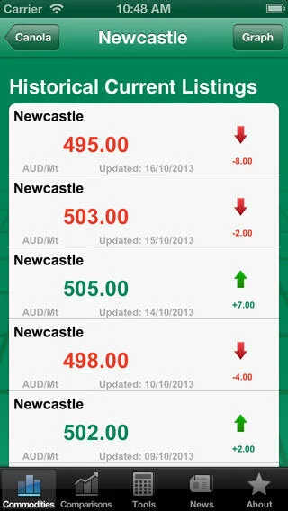 On each easy to view Commodity screen, you will see the most recent published price as well as a snap shot of historical data. A green / red up down arrow will indicate the price movement since the prior published price. You are able to manipulate the currency of each Commodity you are looking at to allow a greater understanding of the impact currency has on global commodity price trends.
